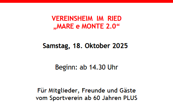 Am Samstag, den 18. Oktober 2025, treffen wir uns ab 14:30 Uhr im Vereinsheim „Mare e Monte 2.0“ im Ried.